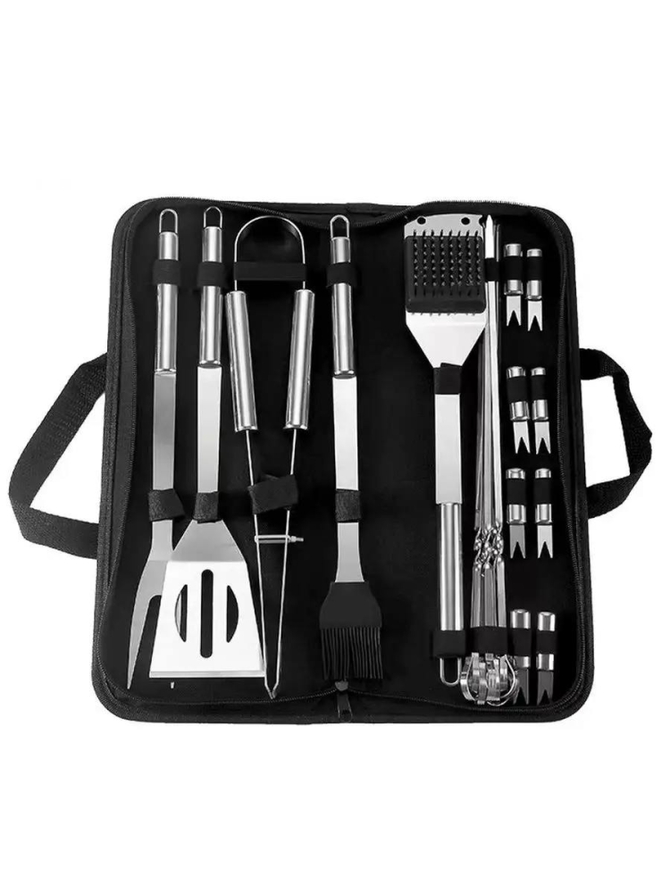 Мужской подарочный набор посуды для решетки гриль на мангал барбекю содержат все самое необходимое, и станут полезным аксессуаром для отдыха на природе и для загородного пикника, для газовых грилей, для угольных грилей. Повысьте комфорт с шашлычным набором аксессуаров при приготовлении пищи, длинные ручки и качественный металл обеспечат комфортное взаимодействие с продуктами на огне, не давая вам обжечься. Широкая лопатка с острой режущей кромкой и отверстием для открывания бутылок пива или других напитков позволит с легкостью перевернуть большой кусок мяса или рыбы, гамбургер, не разломив его. Щипцы для гриля подойдут для приготовления куриных крыльев, сосисок, овощей или грибы шампиньоны. Кисточкой можно нанести вкусный соус барбекю или ароматное масло. Вилкой вы легко снимете готовые продукты с гриля и сможете проверить их готовность. 4 держателя можно использовать как мини вилки для небольших кусочков мяса и кукурузы. Универсальные стальные шампуры для шашлыка с термостойкими ручками. Щетка с металлической щетиной позволяет легко очистить жир и сажу с разных поверхностей. Подарочный набор на 23 февраля для мужчин или подарочные наборы на новый год можно собрать из набора для барбекю и пивной набор в подарочную коробку. Мужской набор посуды для походов будет хорошим дополнением к туристическому набору или набору для рыбака и станет отличным подарком папе, мужу на День рождения или подарком мужчинам на Новый год в новогодней упаковке. Компактный кейс мужского набора кухонных инструментов в складной сумочке можно хранить в шкафу для кухонной утвари, в багажнике автомобиля.