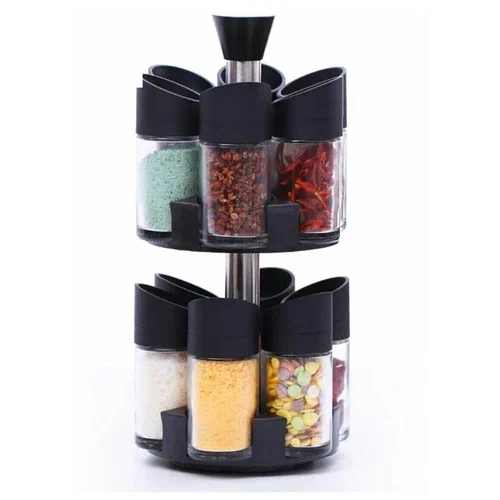 Набор для специй двухъярусный из 13 предметов: 12 баночек+подставка. Баночки имеют разные отверстия для крупных и мелких специй. Подставка вращается на 360 градусов. Набор для специй станет отличным подарком каждой хозяйке. Оригинальные емкости, компактно размещенные на вращающейся подставке, крышки и баночки из высококачественного пластика. С нашим набором специи будут храниться в организованном порядке и легко доступны благодаря вращающейся подставке, а приготовление любимых блюд станет приятнее. Перед первым применением промойте все части с моющим средством, просушите или протрите полотенцем. Засыпайте специи только в абсолютно сухие баночки. Емкости для специй и приправ отличный вариант для оптимизации пространства на кухни. Набор для специй очень компактный, он отлично подойдет для кухонь с небольшим рабочим пространством, для небольшой обеденной зоны, для зоны барбекю. Набор из баночек для специй отличная находка для удобства на кухни при приготовлении. Хранение специй. Хранение на кухне. Ёмкость для приправ. Органайзер для приправ.