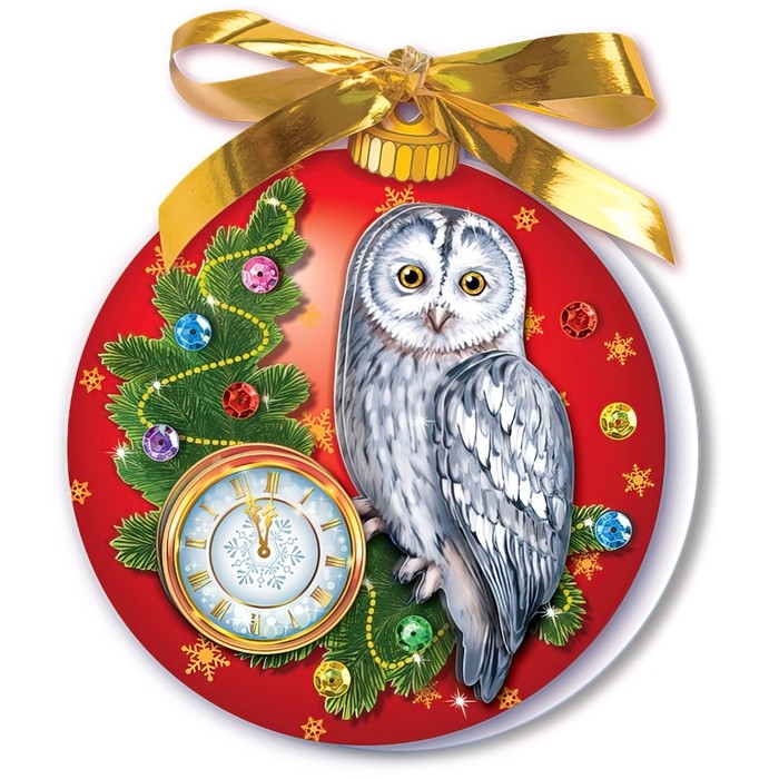 Открытка с изображением пушистой совы, новогодних часов и снежной елки станет ярким акцентом на ёлке, сохраняя теплые слова поздравления. Набор включает все необходимые материалы, включая двусторонние клейкие квадратики скотча для легкого и удобного декорирования.