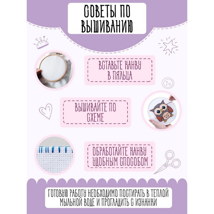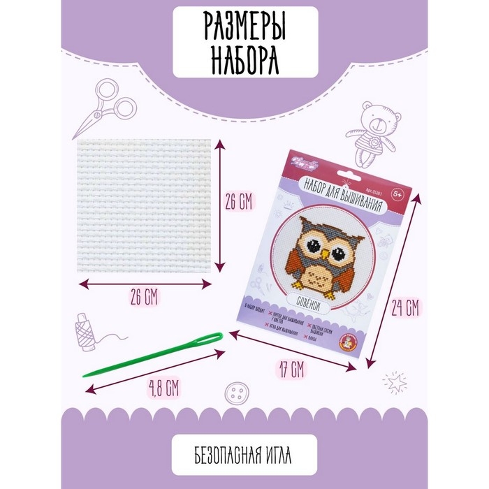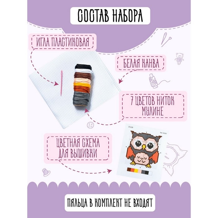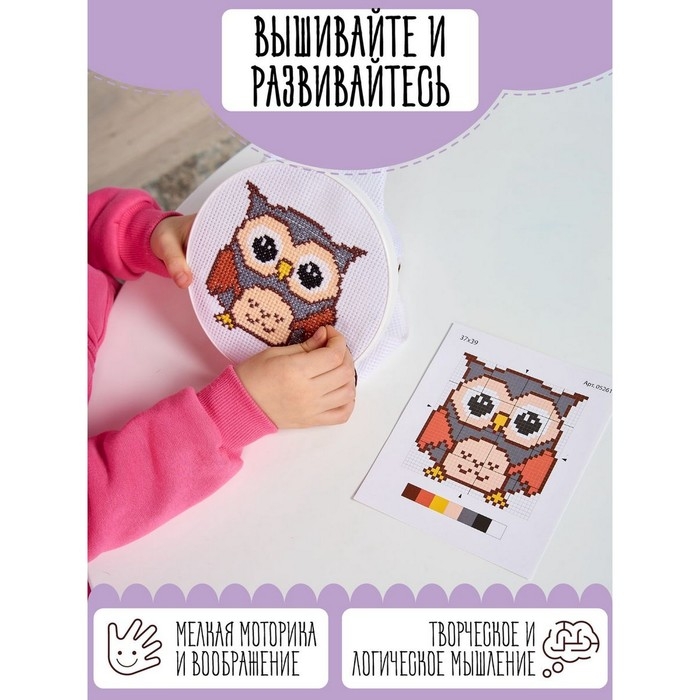 Набор для творчества «Совёнок» — это увлекательное занятие, которое развивает мелкую моторику, воображение, творческое и логическое мышление. Вышивка на канве станет отличным подарком ребёнку или подростку, начинающих заниматься рукоделием.