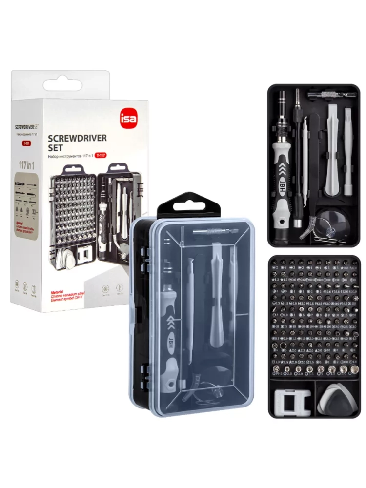 Многофункциональный набор отверток состоит из 98 сменной насадки и 19 аксессуаров для разборки, которые подходят для ремонта большинства современных электронных устройств, ноутбуков, мобильных телефонов, ПК, часов, планшетов, очков, фотоаппаратов, игрушек. Каждая насадка изготовлена из высококачественной стали с твердостью до 60HRC. Все биты изготовлены со строгим контролем качества с высокой точностью на немецком оборудовании, чтобы все ваши ремонтные работы были точными и надежными.