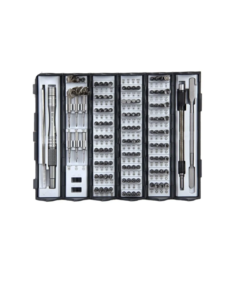 Большой универсальный набор инструментов оснащен противоударным кейсом - тубусом для хранения. Включает в себя 122 сменные прецизионные биты из легированной и углеродистой стали. Антикоррозийное покрытие защищает отвертки от воздействия влаги и ржавчины. В комплекте инструментов для дома также имеется 6 аксессуаров для различных задач: магнитная отвёртка для точных работ, пинцет, намагничиватель/размагничиватель, металлический лом и гибкий удлинительный вал для ремонта в труднодоступных местах. В число прецизионных насадок входят: крестообразные (PH и PZ), звездообразные пятилучевые (Ts), звездообразные шестилучевые (T и TH), под прямой плоский шлиц (SL), с шестигранным и треугольным шлицем (H и 2,0; 2,3; 2,7; 3,0), под трёхлопастный паз (Tw), с квадратным пазом (SQ), в форме M, Y, U, Pry. Наконечник отвертки - магнитный, если его намагнитить с помощью детали из комплекта. Ручка из алюминиевого сплава: эргономичная и нескользящая. Биты можно вставлять в удлинитель (он же - короткий столб), а затем в шуруповерт и работать на малых оборотах. Набор предназначен для ремонта большинства современных электронных устройств (игровых консолей playstation, iphone, компьютера, ноутбуков, фотоаппаратов). А так же часов и очков, сборке и разборке корпусов мобильных телефонов и другой техники или электроники. Набор для машины можно брать с собой в поездки. Подойдет в качестве практичного подарка для мужчин коллег на Новый год или день рождения.