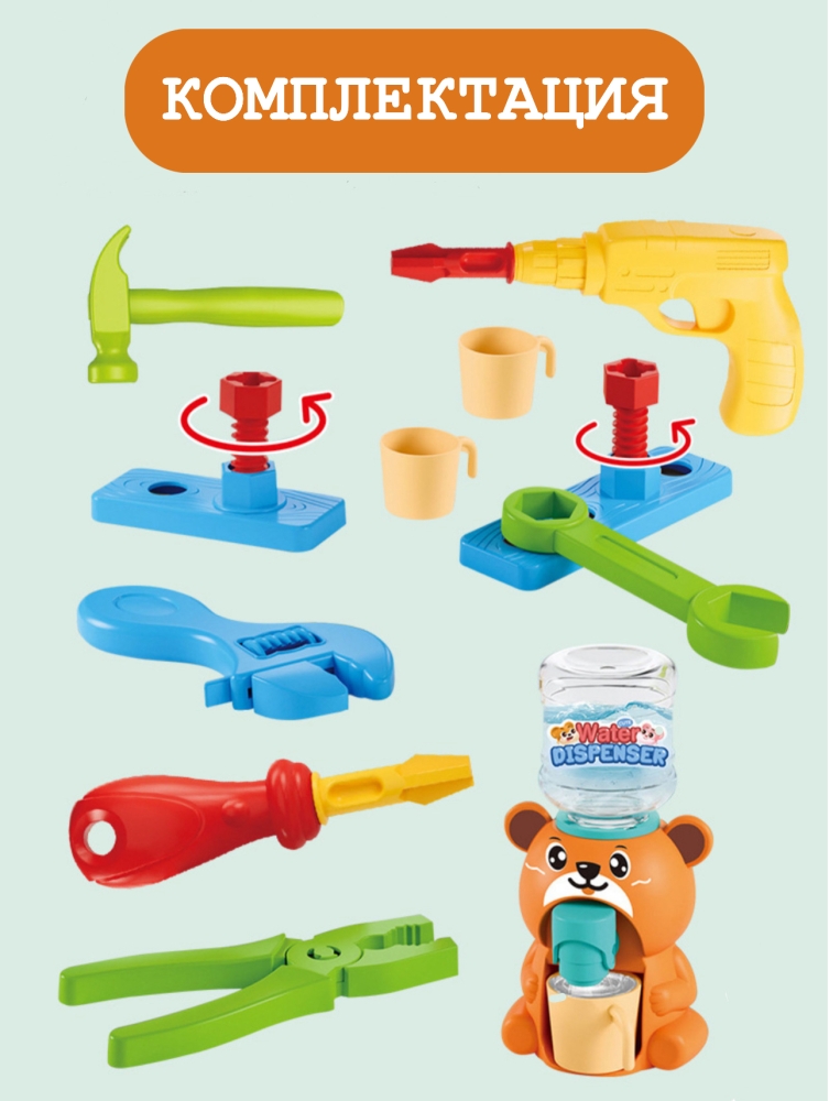 В дополнение к набору инструментов, мы предлагаем детский кулер. Этот стильный мини-кулер не только станет отличным аксессуаром для игр, но и добавит элемент реалистичности в ролевые игры. Кулер выполнен в ярких цветах и предназначен для того, чтобы "освежить" вашего маленького мастера после увлекательного рабочего дня. Дети смогут "угостить" своих друзей и игрушки прохладительными напитками, что сделает игру еще более захватывающей.
