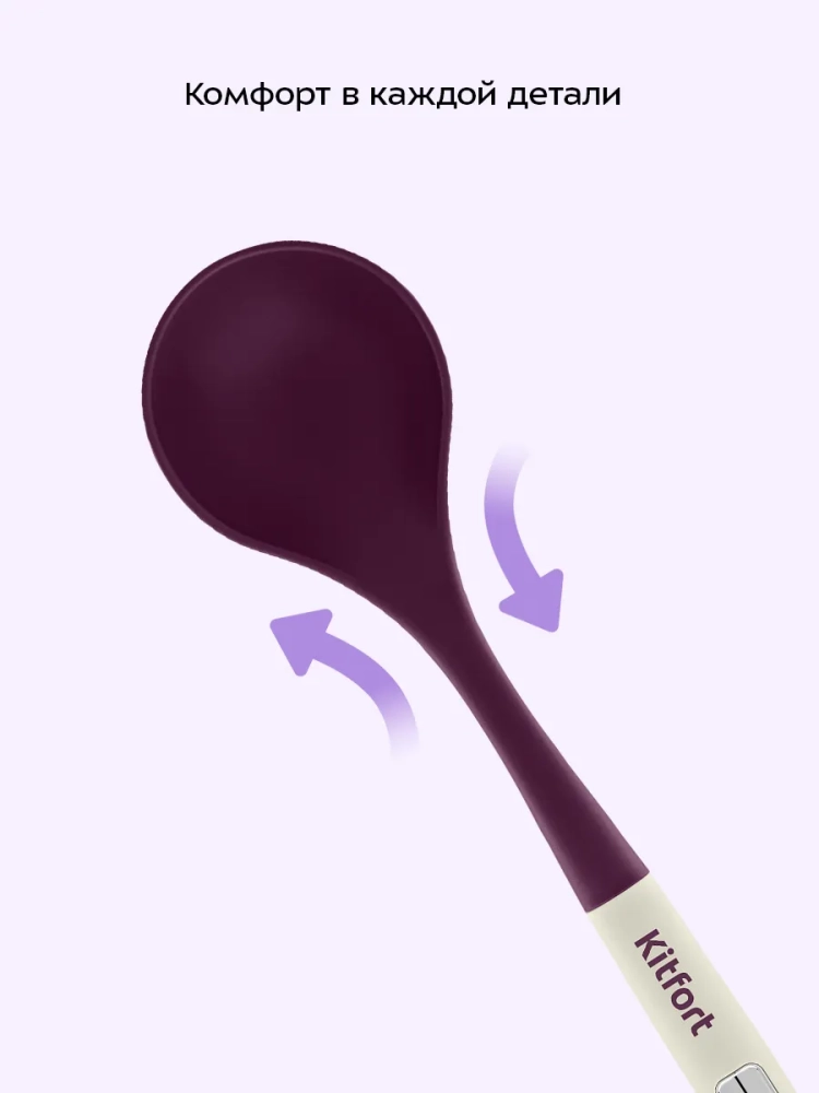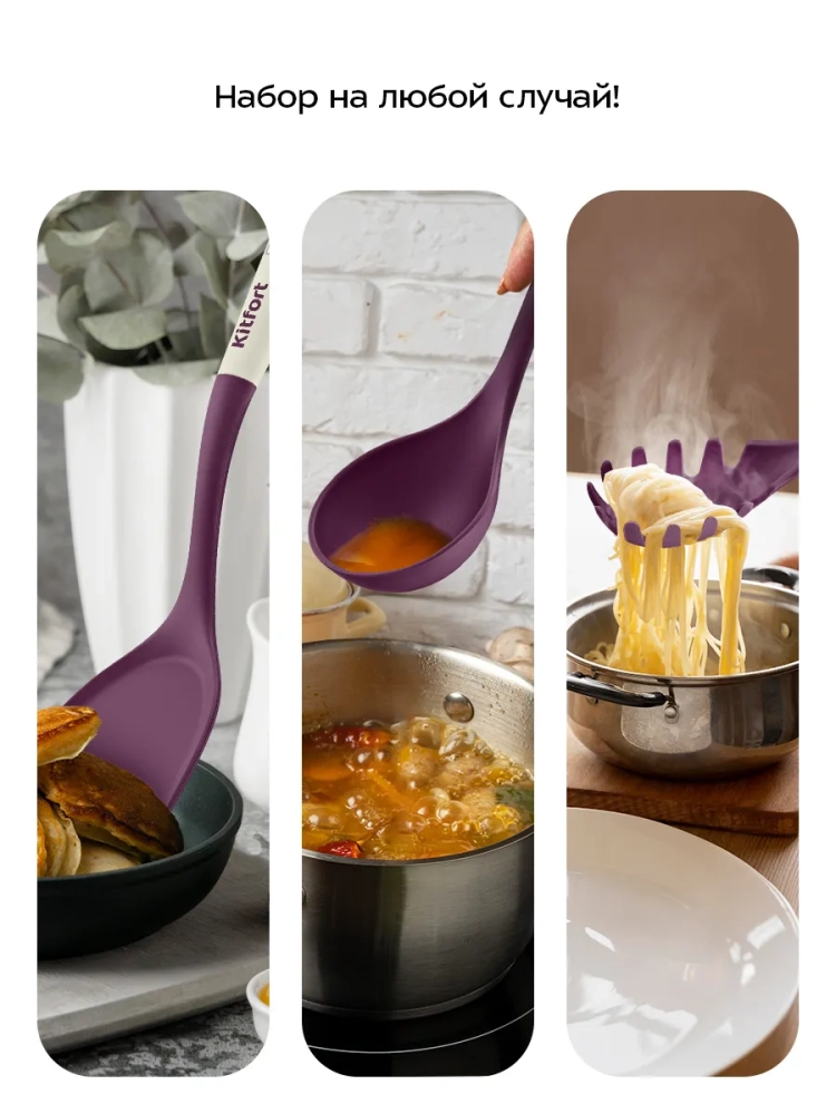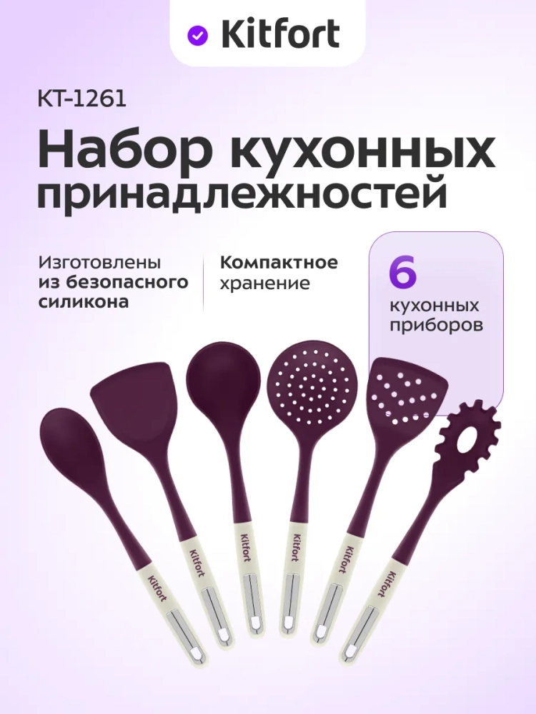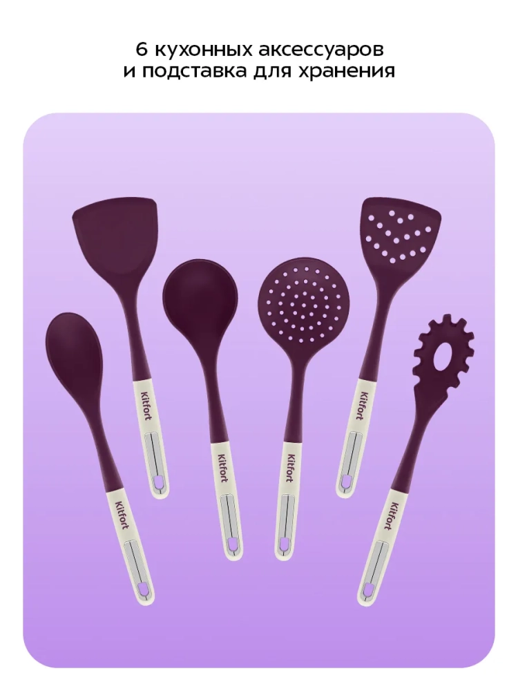 Набор кухонных принадлежностей Kitfort КТ-1261 состоит из 6 кухонных аксессуаров на подставке: половника, лопатки, лопатки с отверстиями, ложки для спагетти, ложки и шумовки.