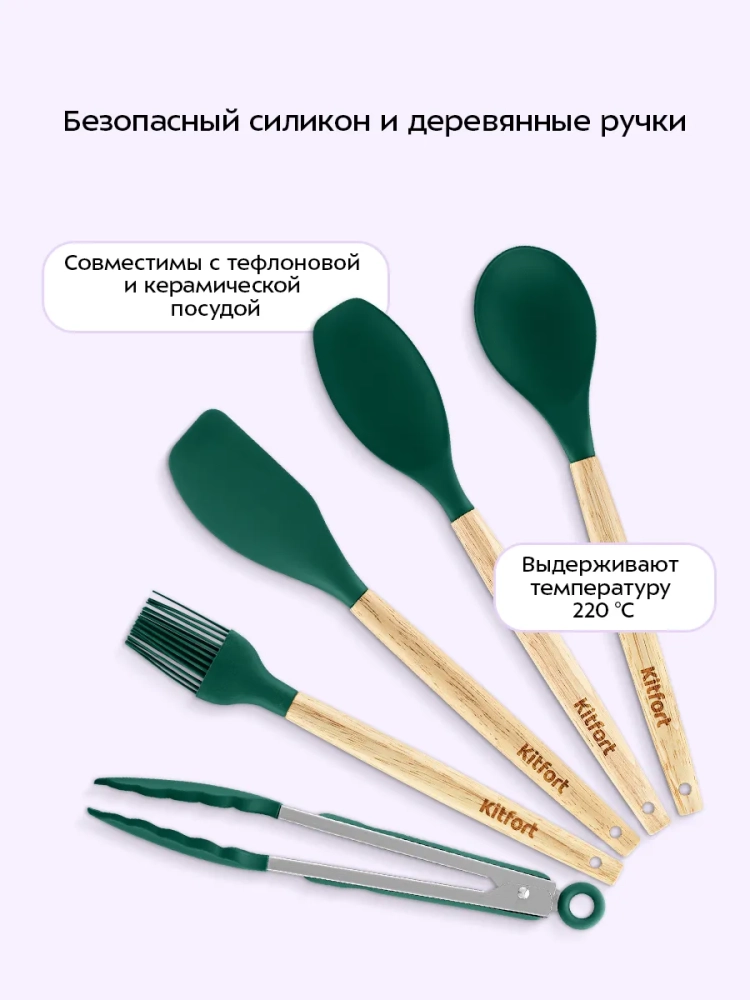 Термостойкий силикон аксессуаров выдерживает температуру +220 °С. Все аксессуары, кроме щипцов, имеют деревянную рукоятку. Деревянная рукоятка не нагревается в процессе готовки, поэтому вы не обожжетесь об нее. Щипцы выполнены из сочетания силикона и нержавеющей стали. Силиконовые вставки на щипцах предотвращают получение ожога, если части из нержавеющей стали нагрелись во время готовки.
