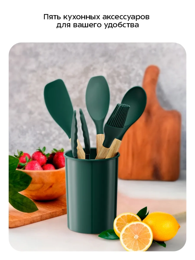 Стильный и многофункциональный набор кухонных аксессуаров не займет много места на вашей кухне благодаря удобной подставке. Также все аксессуары имеют отверстие, за которое вы можете их повесить на крючок.