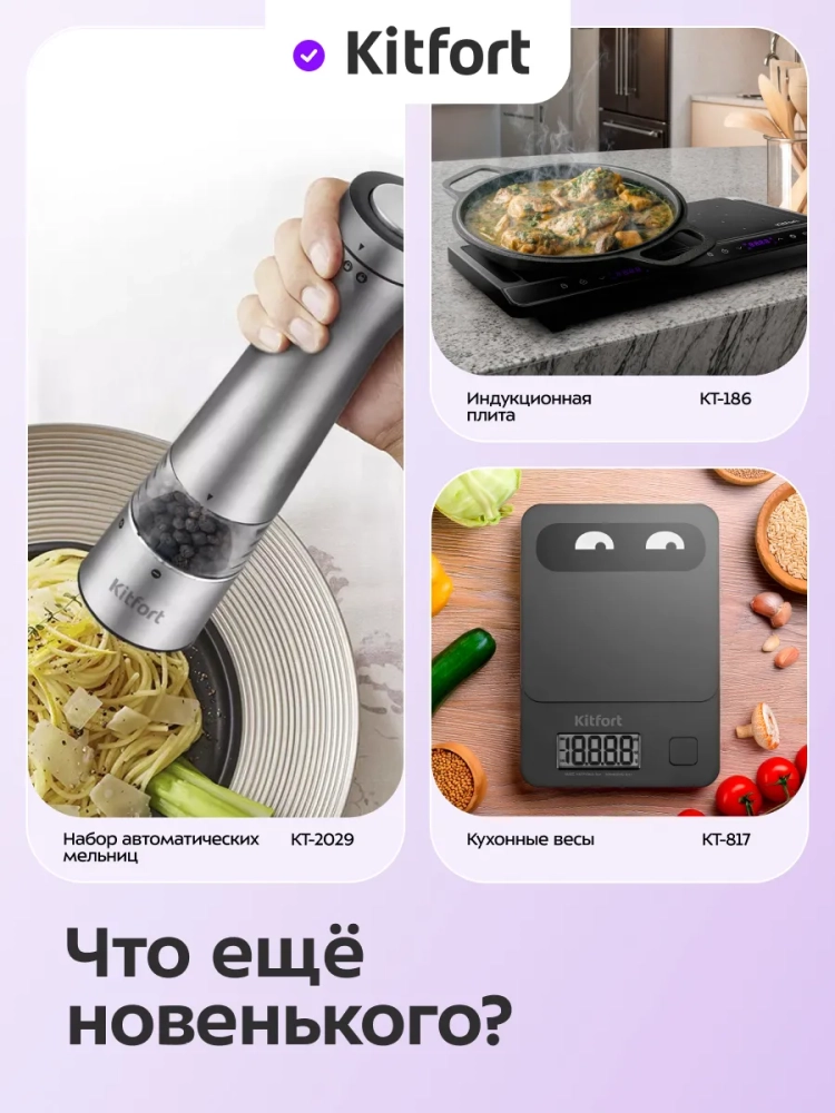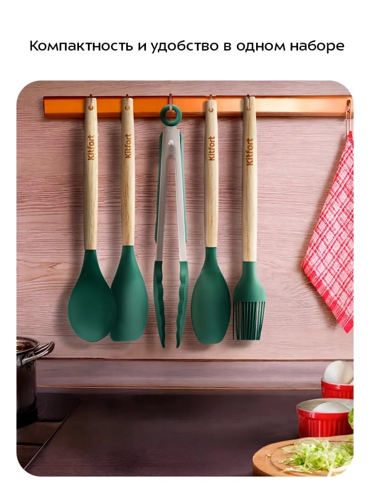Набор кухонных принадлежностей Kitfort КТ-1262 состоит из подставки и 5 кухонных аксессуаров: кулинарного шпателя, половника, ложки для выпечки, кисточки и щипцов.