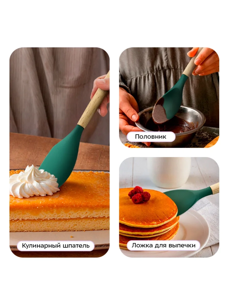 Силикон, из которого выполнены кухонные аксессуары, безопасен для здоровья человека. Силиконовая рабочая поверхность с жестким каркасом не впитывает запахи и не царапает посуду, поэтому кухонные аксессуары из набора можно использовать с тефлоновой и керамической посудой.