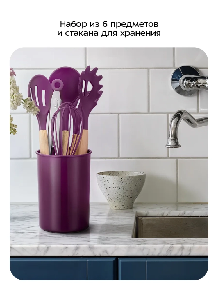 Стильный и многофункциональный набор кухонных аксессуаров не займет много места на вашей кухне благодаря удобной подставке. Также все аксессуары, кроме венчика, имеют отверстие, за которое вы можете их повесить на крючок.