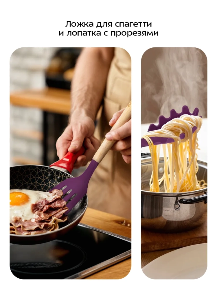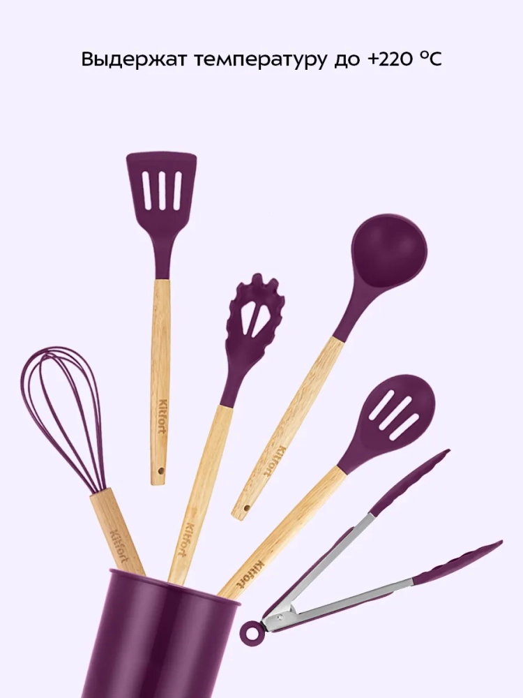 Термостойкий силикон аксессуаров выдерживает температуру +220 °С. Все аксессуары, кроме щипцов, имеют деревянную рукоятку. Деревянная рукоятка не нагревается в процессе готовки, поэтому вы не обожжетесь об нее. Щипцы выполнены из сочетания силикона и нержавеющей стали. Силиконовые вставки на щипцах предотвращают получение ожога, если части из нержавеющей стали нагрелись во время готовки.