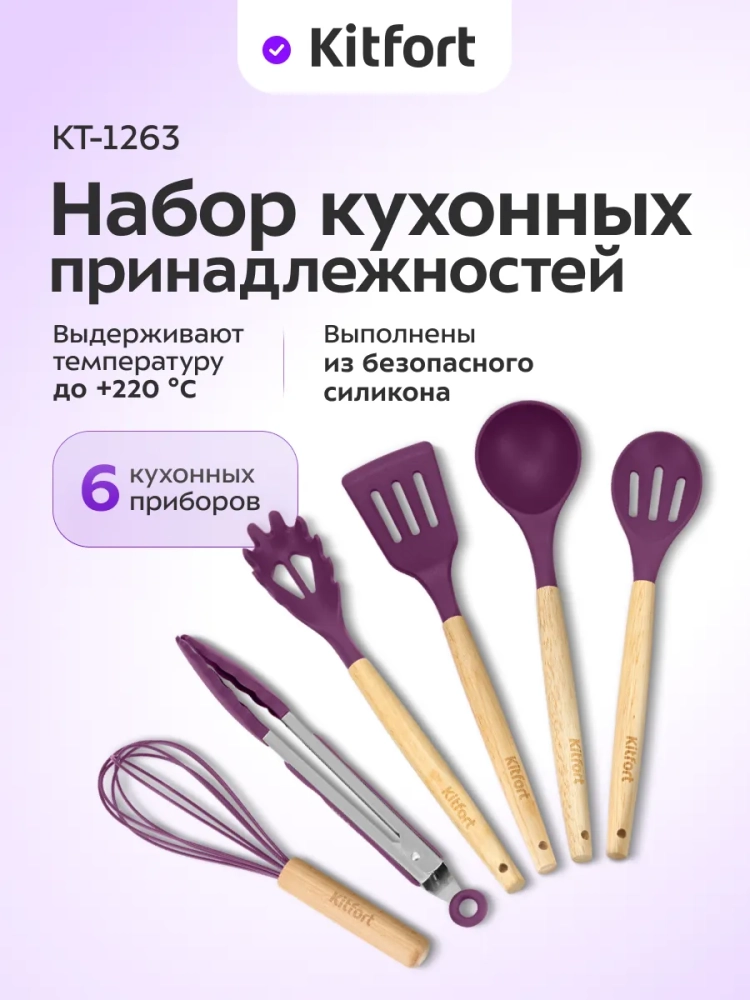 Набор кухонных принадлежностей Kitfort КТ-1263 состоит из подставки и 6 кухонных аксессуаров: половника, лопатки с прорезями, ложки для спагетти, ложки с прорезями, венчика и щипцов.