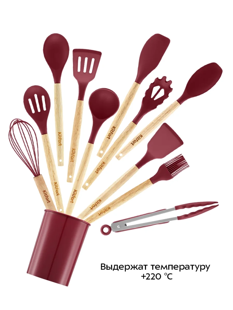 Набор кухонных принадлежностей Kitfort КТ-1264 состоит из подставки и 11 кухонных аксессуаров: половника, лопатки, лопатки с прорезями, ложки для спагетти, ложки, ложки с прорезями, ложки для выпечки, кулинарного шпателя, кисточки, венчика и щипцов.