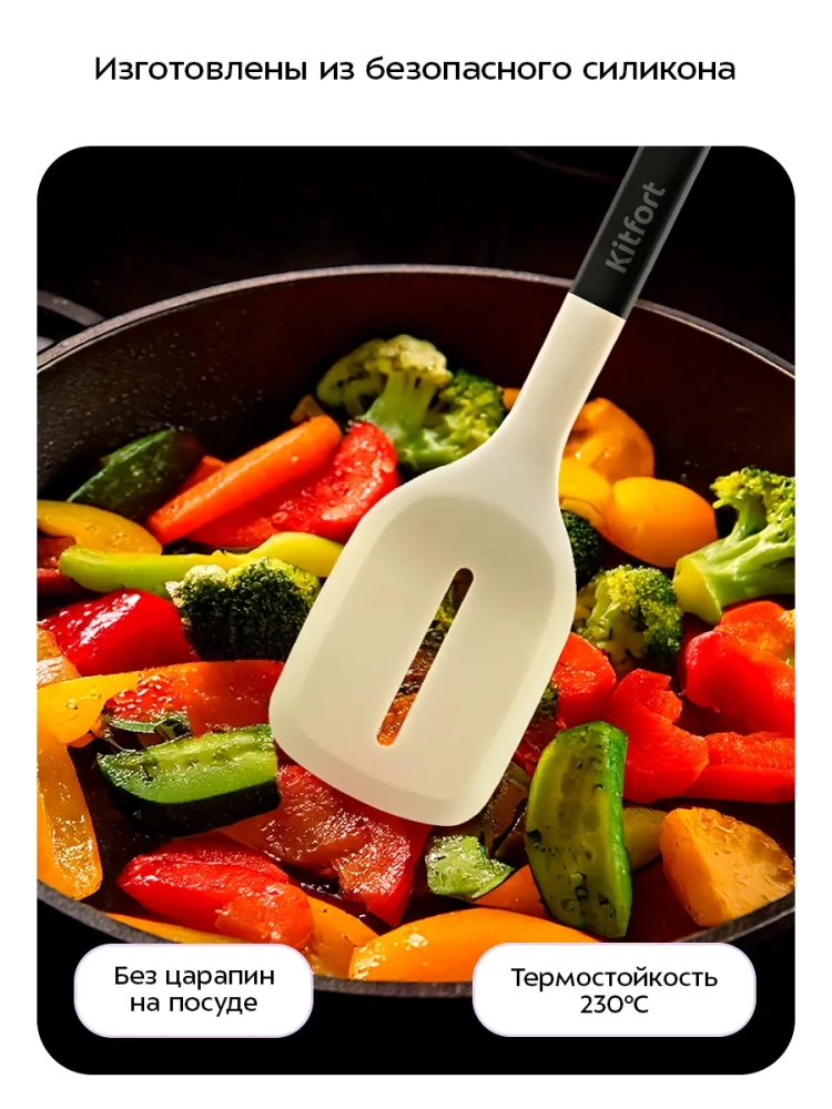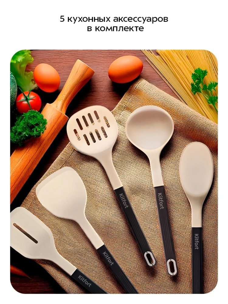 Силиконовые лопатки и половники обеспечивают комфортное использование благодаря эргономичному дизайну. Набор кухонных принадлежностей включает в себя также шумовку и ложку, которые дополняют функциональность набора. Эти кухонные приборы станут отличным дополнением к вашей кухонной посуде, обеспечивая удобство и эффективность в процессе приготовления пищи.