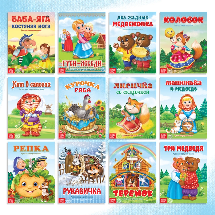 Окунитесь в волшебный мир вместе с БУКВА-ЛЕНД! Со сборником известных и всеми любимых сказок малыш отправится в увлекательное путешествие, где встретится с добрыми героями, весёлыми зверятами и птичками, научится хорошим манерам, узнает, что добро всегда побеждает зло! В наборе книг представлены сказки: «Теремок», «Баба-Яга, костяная нога», «Три медведя», «Рукавичка», «Два жадных медвежонка», «Кот в сапогах», «Колобок», «Гуси-лебеди», «Лисичка со скалочкой», «Репка», «Машенька и медведь», «Курочка ряба». Старайтесь как можно раньше привить малышу любовь к чтению — это полезная привычка, которая пригодится ему на протяжении всей жизни! Чадо будет в восторге от волшебных историй и цветных картинок, а родителей порадует формат книг, крупный шрифт, удобный для чтения, и привлекательная цена. Набор книг рекомендован детям с рождения.