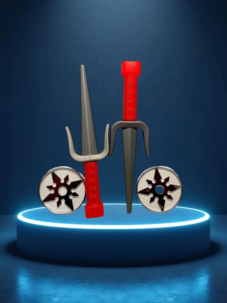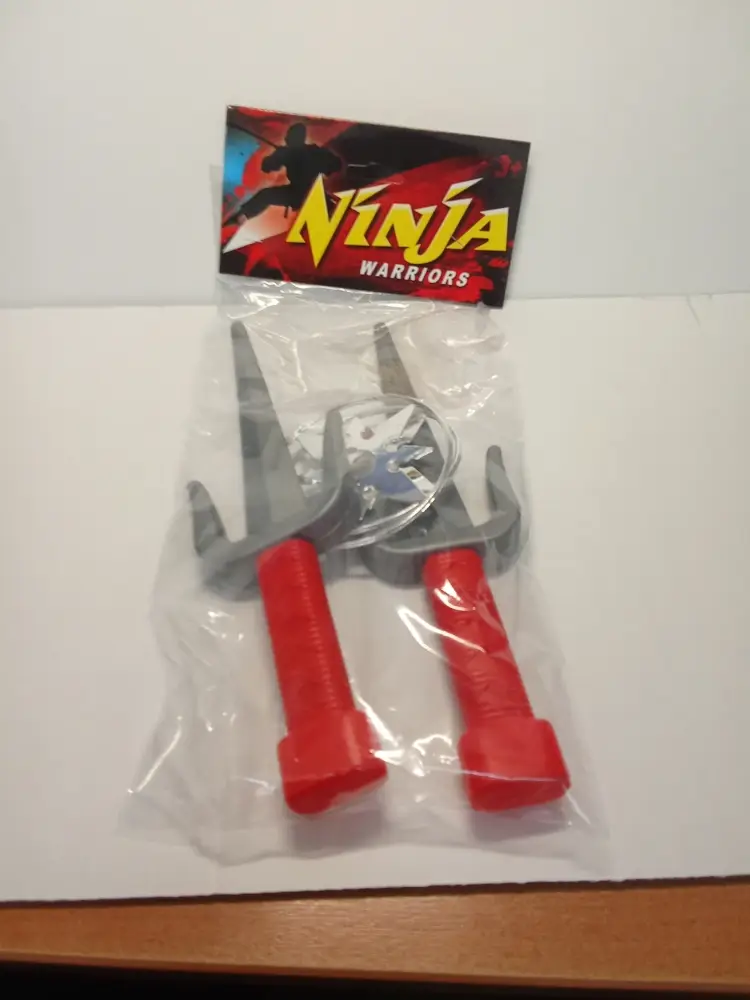 Это детский игрушечный набор ниндзя с кинжалом и сюрикенами. Набор позволяет ребёнку погрузиться в мир сражений. В комплекте: кинжалы-сай и 2 сюрикена.