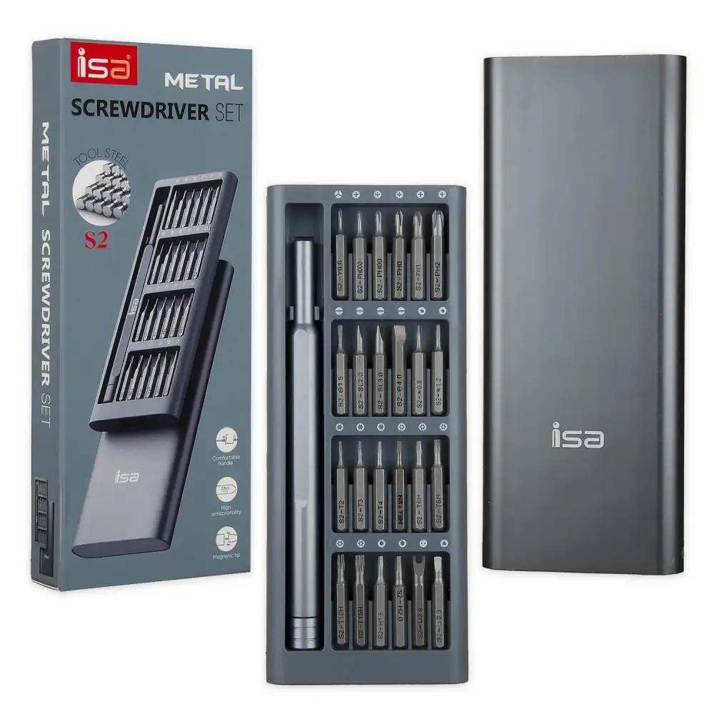 В набор входит 24 высокоточных бит + пенал. 1 предмет для монтажа: Отвертка - 1 шт. Твердость материала - 60 HRC. Антикоррозийное покрытие - да. Материал корпуса бит - металл. Вес товара