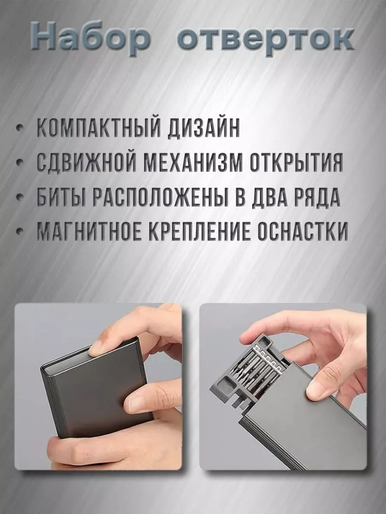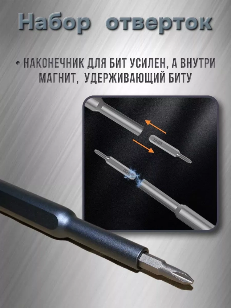 Набор отверток 50 в 1 — ваш идеальный помощник для точных работ. Этот комплект, состоящий из 50 предметов, станет незаменимым инструментом как для профессионалов, так и для домашних мастеров. В его состав входят отвертки, насадки и удобный кейс для хранения, который обеспечивает надежную транспортировку и защиту всех компонентов. Кейс, выполненный из прочного алюминия, имеет стильный дизайн с закругленными краями и магнитным фиксатором, что делает его использование простым и удобным. Качество насадок гарантировано, так как они изготовлены из высококачественной инструментальной стали S2, обладающей высокой прочностью и стойкостью к механическим повреждениям. Каждая бита четко промаркирована, а на кейсе есть соответствующие схемы, что позволяет быстро находить нужный инструмент. Благодаря магнитным насадкам вы сможете уверенно закручивать саморезы, не опасаясь их соскальзывания. Набор весит всего 310 г, что делает его легким для переноски и удобным в использовании. Длина предмета составляет 16,5 см, а в комплект входят не только отвертки, но и пинцет, который поможет в работе с мелкими деталями. Этот набор станет отличным выбором для ремонта электроники, сборки мебели и выполнения множества других точных работ. Обеспечьте себе надежный инструмент, который будет всегда под рукой.
