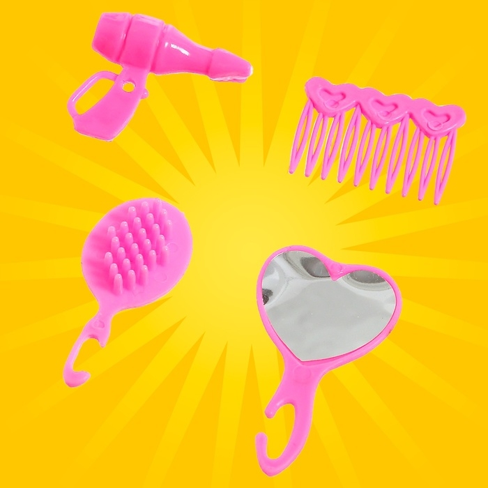 - В комплекте есть аксессуары: расчёска, зеркало, фен, заколка-гребешок. С ними игра станет реалистичнее!