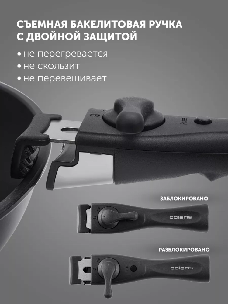 В универсальный набор для кухни входит: Две сковороды (24см и 26см) для жарки, которые можно использовать с минимальным количеством масла, благодаря антипригарному покрытию. Большая глубокая сковородка ВОК (26см) для варки и тушения мяса и птицы,а также картофеля и других овощей. Блинница (22 см). Блинная сковорода уникальной формы создана для вкусного и быстрого завтрака: воздушные панкейки, оладьи, яичница и омлет. Вы сможете без труда приготовить любимые блюда. Съемная бакелитовая ручка с двойной защитой, которая не скользит и не нагревается. Стеклянная крышка универсального диаметра 24-26 см со специальной выемкой для съемной ручки для удобного хранения. Подвесные кухонные принадлежности: лопатка и ложка из высококачественного пластика и деревянный распределитель теста в форме палочки для раскатки идеально ровных блинов.