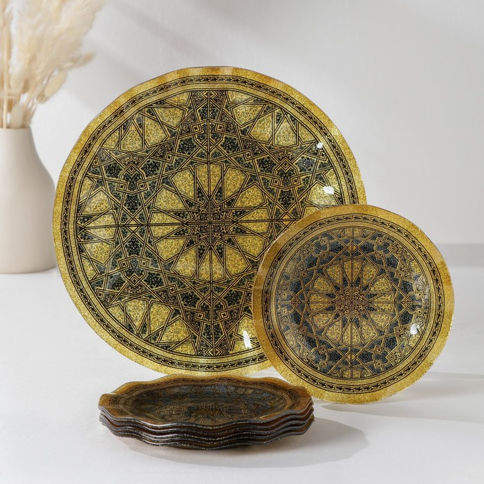 Набор столовый «Вернисаж» состоит из 7 предметов: большого блюда и 6 тарелок. Посуда сделана из иранского стекла. Набор имеет красивый узор и подойдёт для праздничного стола. Большое блюдо можно использовать для подачи горячего, например, плова, а маленькие тарелки — для различных закусок.