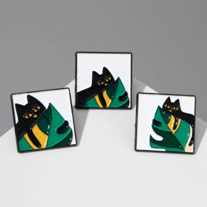 Набор значков (3шт) "Кот" прячущийся, цветной в чёрном металле