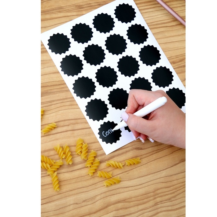 - Для организации пространства на кухне. Сортируйте контейнеры с крупой — просто наклейте на контейнер стикер и подпишите его маркером.