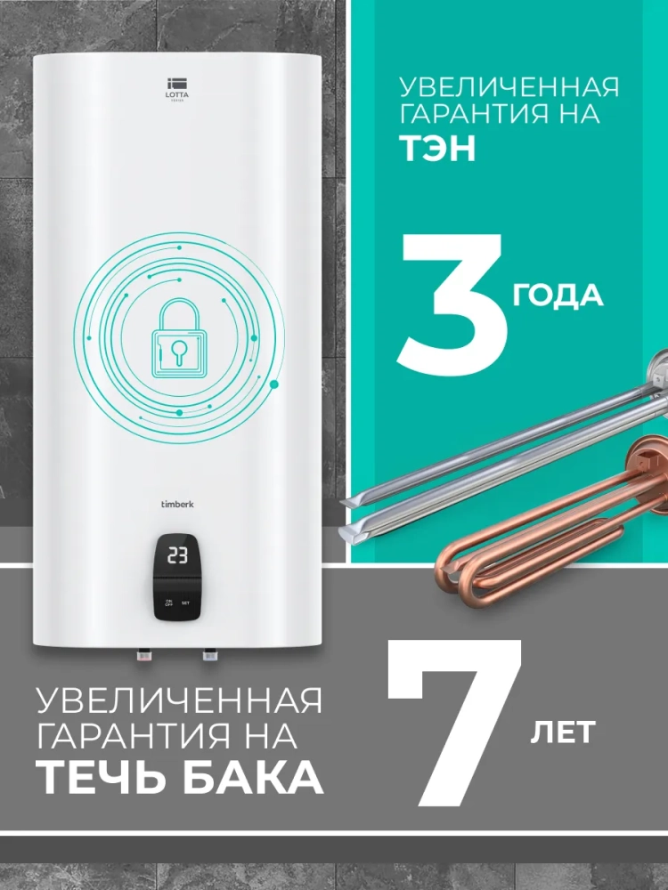 Увеличенная гарантия на течь резервуара – 7 лет, на нагревательный элемент – 3 года + специальная программа страхования.