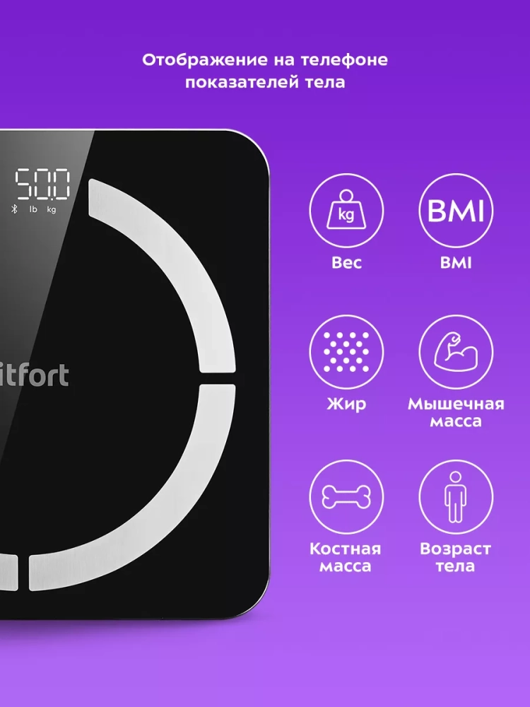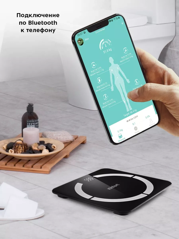 Электронные напольные весы обеспечивают высокую точность измерения, что очень важно людям, следящим за своим весом. Весы Kitfort КТ-841 представляют современное поколение «умных» весов, поскольку их можно подключить к приложению Bitafit, включив передачу данных через Bluetooth. Приложение выводит на экран телефона разные параметры биоимпедансного анализа: вес, индекс массы тела, мышечную массу, костную массу, процентное содержание воды и жира в организме и т.д.