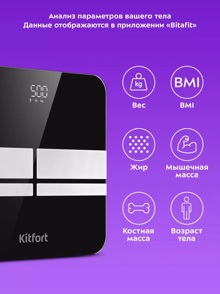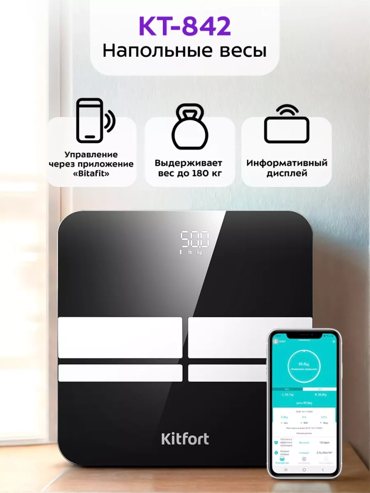 Электронные напольные весы обеспечивают высокую точность измерения, что очень важно людям, следящим за своим весом. Весы Kitfort КТ-842 представляют современное поколение «умных» весов, поскольку их можно подключить к приложению Bitafit, включив передачу данных через Bluetooth. Приложение выводит на экран телефона разные параметры биоимпедансного анализа: вес, индекс массы тела, мышечную массу, костную массу, процентное содержание воды и жира в организме и т.д.