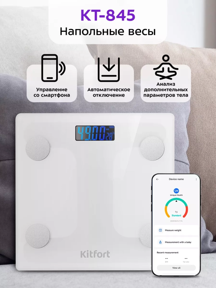 Напольные весы электронные умные КТ-845 — это современная техника для точного измерения веса человека. Эти напольные весы идеально подходят для использования дома, обеспечивая надежные данные для контроля веса и похудения. Электронные весы оснащены умными функциями, которые делают их незаменимыми в процессе фитнеса и поддержания здорового образа жизни.