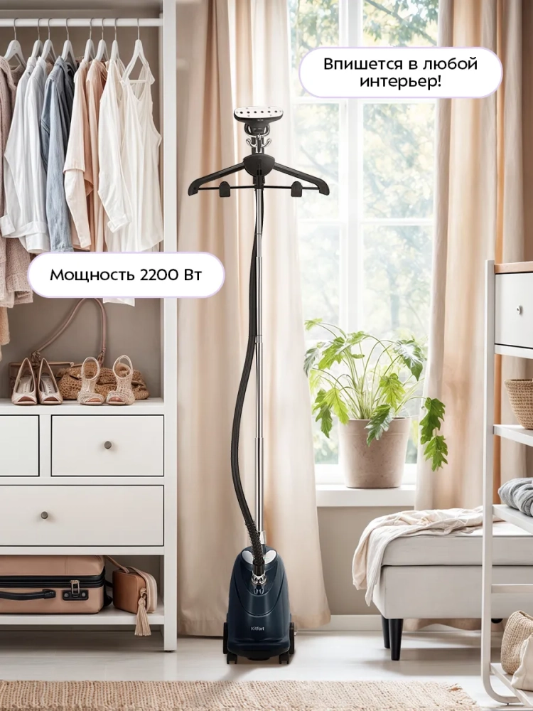 Вертикальный отпариватель для одежды Kitfort КТ-9355 — это незаменимый помощник в глажке и уходе за текстильными изделиями. Этот напольный прибор отличается высокой мощностью 2200 Вт, что позволяет быстро и эффективно справляться с любыми складками на одежде. Благодаря возможности вертикального отпаривания, вы можете обрабатывать вещи прямо на вешалке или стойке, не снимая их. Это особенно удобно для освежения занавесок, портьер и обивки мебели. Kitfort КТ-9355 оснащен складной вешалкой с прищепками, что обеспечивает удобное размещение одежды во время работы. Вы также можете использовать обычную вешалку или подвесить одежду на крючки держателя утюжка. В комплекте идет защитная варежка для безопасности рук при работе с горячим паром. Паровой отпариватель Kitfort обладает емкостью резервуара 2 литра, что позволяет работать более 44 минут без перерыва после разогрева за 45 секунд. Максимальная подача пара достигает 45 г/минуту, обеспечивая эффективное разглаживание даже самых сложных тканей. Длина шнура составляет 1,9 м, а длина парового шланга — 1,6 м обеспечивают свободу передвижения во время работы с устройством. Отпаривание помогает устранить неприятные запахи из сезонной одежды без необходимости стирки благодаря воздействию горячего пара. Если ваша одежда пропахла табаком или другими запахами после пребывания в прокуренном помещении — этот мощный бытовой прибор быстро решит проблему.