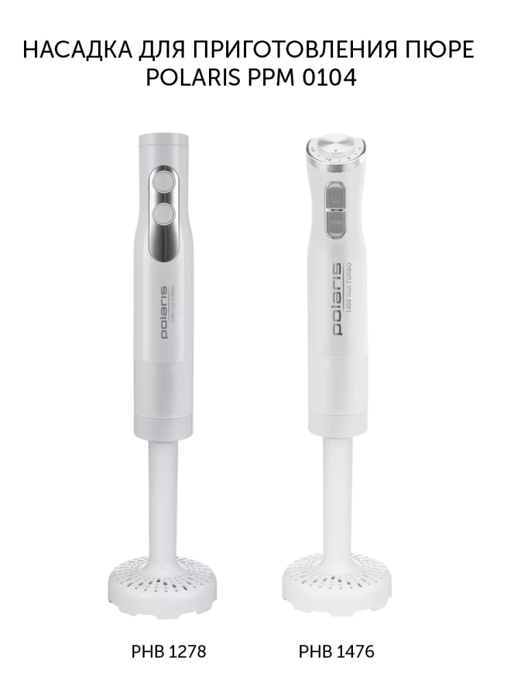 Насадка для приготовления пюре подходит для блендеров POLARIS: PHB 1278, PHB 1283, PHB 1379 Silent, PHB 1380 Silent, PHB 1382L Silent, PHB 1384 Silent, PHB 1476, PHB 1487, PHB 1594, PHB 1583L Silent, PHB 1591L Silent, PHB 1510GL Silent, PHB 1517GL Silent. Идеальна для приготовления воздушного картофельного пюре, также подходит для приготовления нежнейшего пюре из других вареных овощей и детского питания. /p