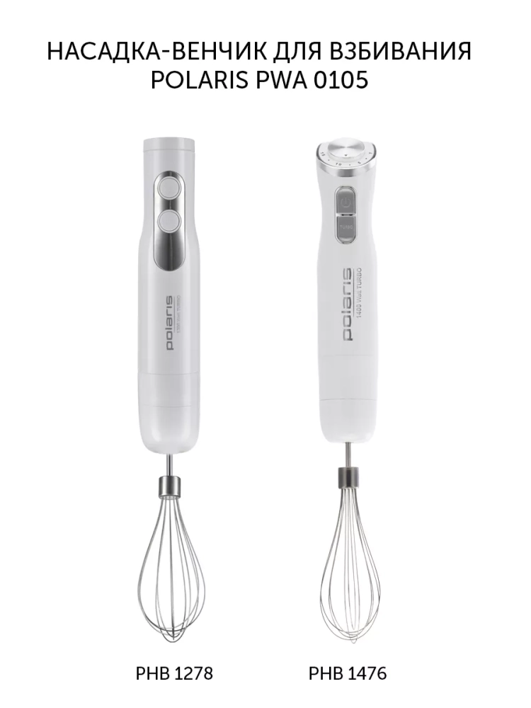 Насадка-венчик для взбивания подходит для блендеров POLARIS: PHB 1278, PHB 1283, PHB 1379 Silent, PHB 1380 Silent, PHB 1382L Silent, PHB 1384 Silent, PHB 1476, PHB 1487, PHB 1594, PHB 1583L Silent, PHB 1591L Silent, PHB 1510GL Silent, PHB 1517GL Silent. Идеальна для приготовления воздушных десертов, пышных омлетов, взбитого белка и сливок.