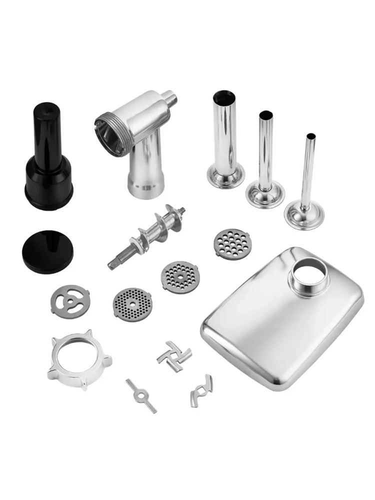 Насадка-мясорубка KT-1300-09. Подходит для модели: КТ-3074. Комплектация: - Загрузочный блок - 1 шт. - Шнек - 1 шт. - Нож мясорубки с четырьмя лопастями - 1 шт. - Нож мясорубки с двумя лопастями - 1 шт. - Решетка с отверстиями 2,8 мм - 1 шт. - Решетка с отверстиями 5 мм - 1 шт. - Решетка с отверстиями 7 мм - 1 шт. - Кольцевая гайка - 1 шт. - Загрузочный лоток - 1 шт. - Толкатель с крышкой - 1 шт. - Насадка для колбас с отверстием 12 мм - 1 шт. - Насадка для колбас с отверстием 18 мм - 1 шт. - Насадка для колбас с отверстием 21 мм - 1 шт. - Опорное кольцо - 1 шт. Вес нетто: 1,00 кг. Вес брутто: 1,06 кг. Размер упаковки: 230 х 130 х 158 мм.