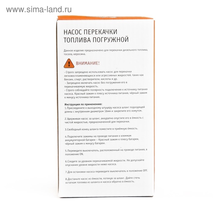 Погружной насос Airline предназначен для перекачки дизельного топлива из бочки, цистерны или любой другой емкости с достаточно узким горлышком. Эксплуатация допускается в широком температурном диапазоне окружающей среды от 5 до 40 градусов. Погружной насос перекачки топлива из бочки комплектуется выключателем, расположенным на проводе, зажимами типа «крокодил» и проводом (3 м.). Чтобы начать работу, достаточно подключить топливный шланг и аккумулятор. Насос имеет четыре опоры, благодаря которым он устойчиво стоит вертикально на дне емкости. Низкая цена и карманные размеры придутся по душе бывалым водителям, которые не хотят переплачивать за предмет первой необходимости.