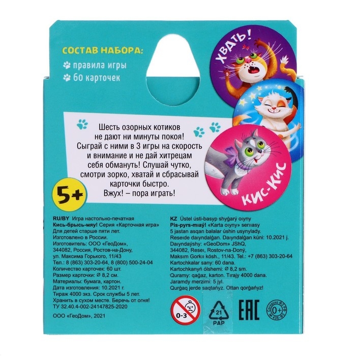 «Кись-брысь-мяу» – настольная игра для самых ловких, быстрых и подвижных и для всех, кто хочет таким стать. В одной коробке – 6 милых котиков и 3 игры с разной механикой: внимательно смотри, вовремя хватай и сбрасывай карточки, быстро выполняй задания – скучать точно не придётся!