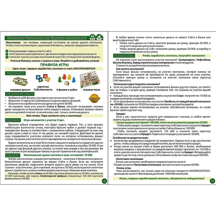 Перед началом каждый участник берёт начальный капитал, карточки собственности, устанавливает флажок своего цвета в области банковского счёта и размещает свою фишку на стартовом поле. Игроки по очереди бросают кубик и перемещают фишку на выпавшее число клеток. Если она попала на свободный участок с фирмой, то его можно купить её за указанную цену. А если клетка занята уже кем-то другим, то необходимо заплатить половину стоимости его владельцу. Чем больше в собственности будет у участника, тем большую прибыль он получит при прохождении полного круга. Также на поле есть и специальные зоны, на которых необходимо выполнять указанные действия. А при попадании фишкой на свой участок игрок получает дополнительный ход. Все виды оплат можно производить как наличными средствами, так и со счёта в банке. Тот, у кого сумма на нём достигнет миллиона, становится победителем.