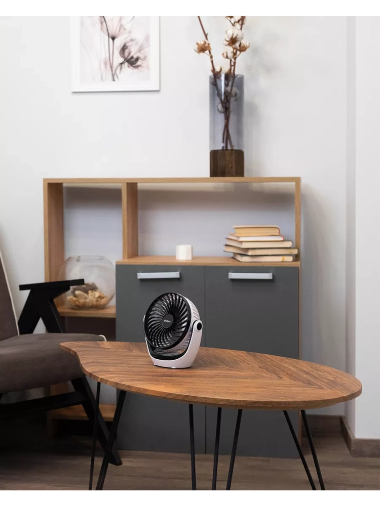 Питание от USB или встроенного аккумулятора Время работы от аккумулятора до 4 часов Время перезарядки – 4 часа Литиевый аккумулятор, рассчитанный на 1000 зарядок 3 скорости воздушного потока Вращение на 360° USB-шнур для зарядки в комплекте Лёгкий и компактный – удобной брать с собой