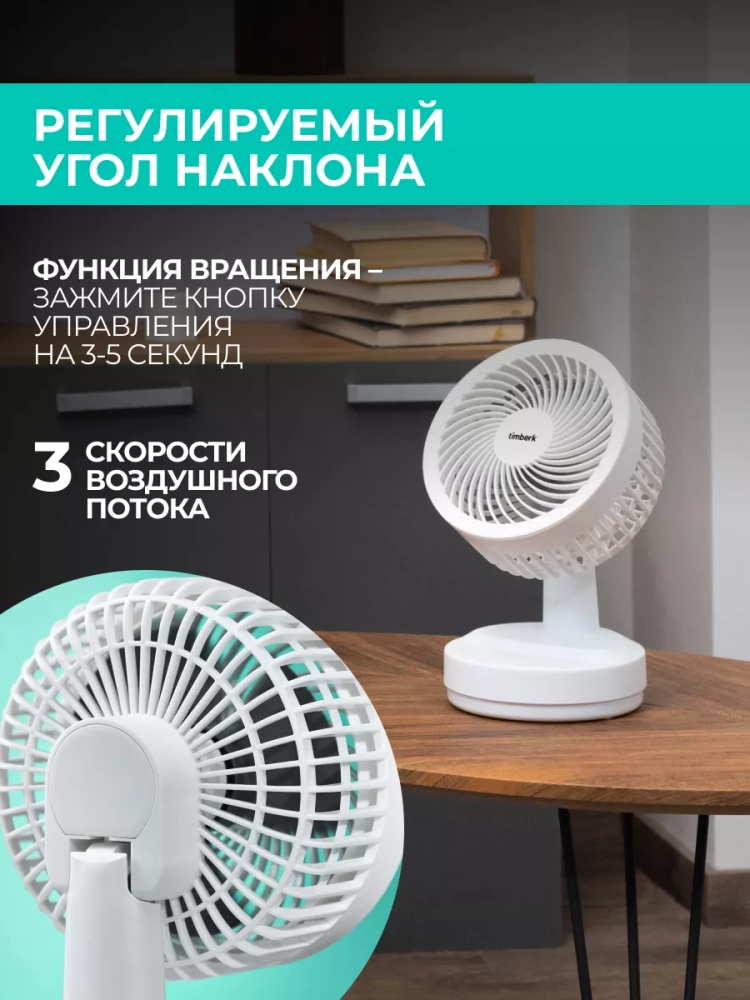 Диаметр: 5 дюймов/12.7 см. Мощность: 4 Вт. Ёмкость аккумулятора 4000 мАч. Вес нетто: 0.695 кг. Размеры прибора: 180х160х250 мм. Питание от USB или встроенного аккумулятора. Время работы от аккумулятора до 6 часов. Время перезарядки 4 часа. Литиевый аккумулятор, рассчитанный на 1000 зарядок. 3 скорости воздушного потока. Функция вращения: зажмите кнопку управления на 3-5 секунд. Регулируемый угол наклона. USB-шнур для зарядки в комплекте. Лёгкий и компактный - удобной брать с собой.