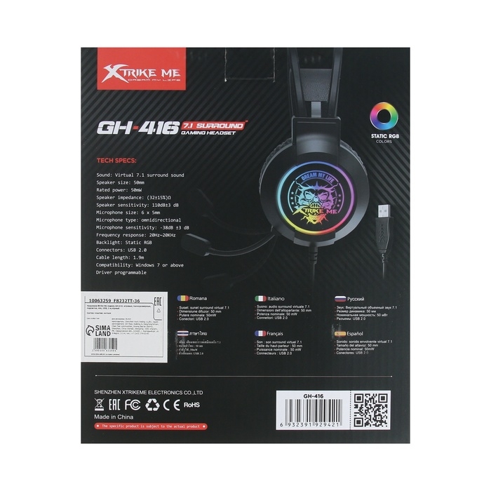 Наушники Xtrike Me GH-416, игровые, полноразмерные, подсветка, mic, USB, 2 м,чёрный