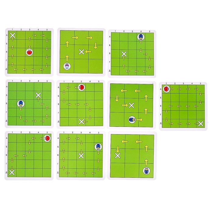 Внутри вы найдёте 3 пластиковых фишки с изображением насекомых и карточки с 20 заданиями.