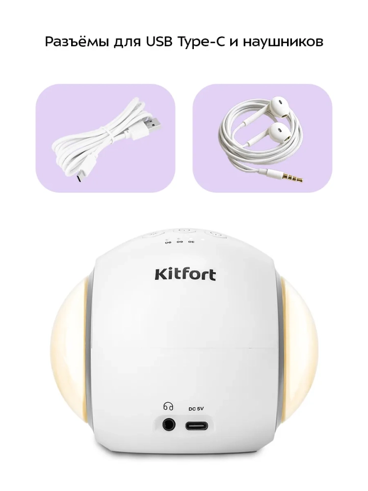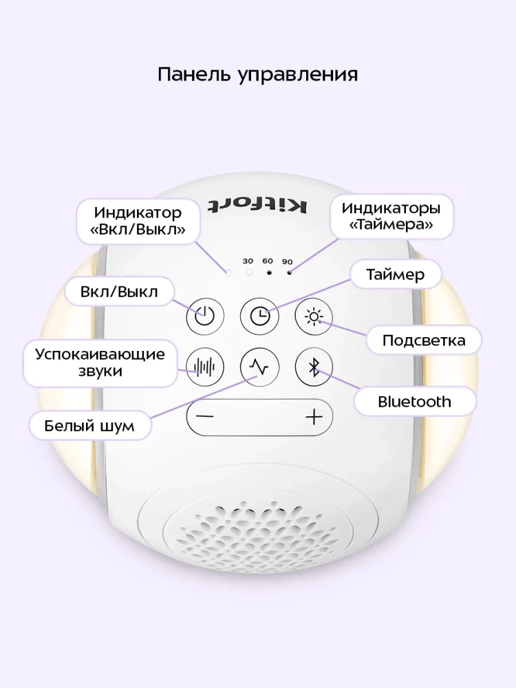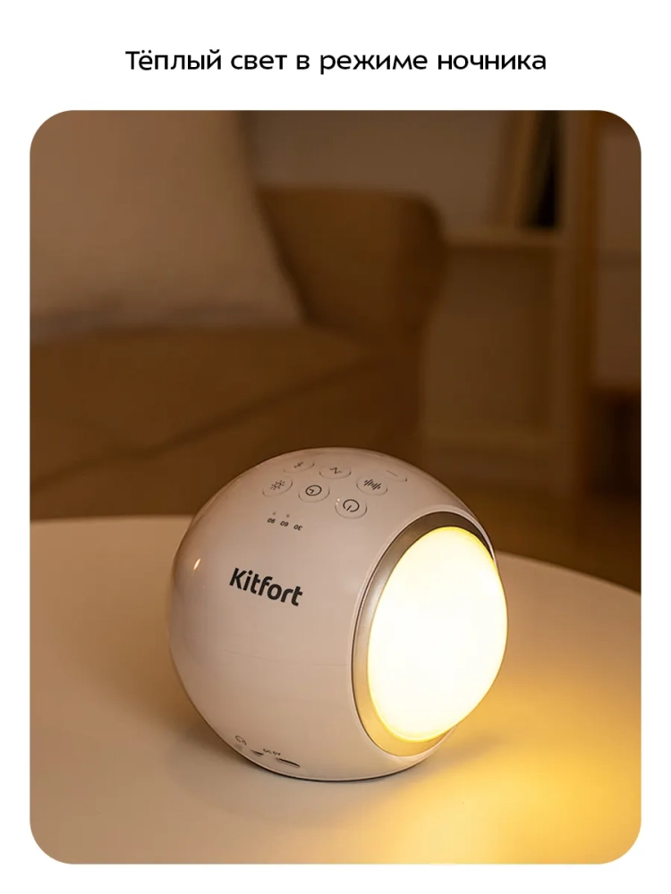 Генератор белого шума «3 в 1» Kitfort KT-3758 — это прибор, который создает монотонный звук с широким частотным диапазоном от 150 до 20000 Гц. Также вы можете использовать устройство в качестве ночника или включить цветную подсветку, либо подключить его к мобильному устройству через Bluetooth, и использовать прибор как колонку.