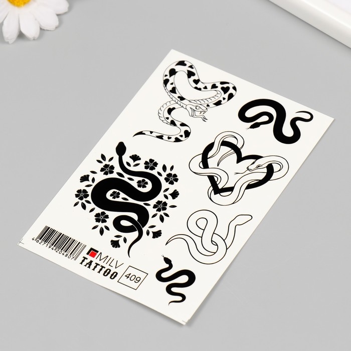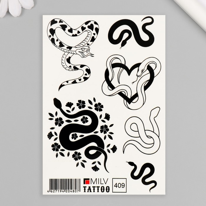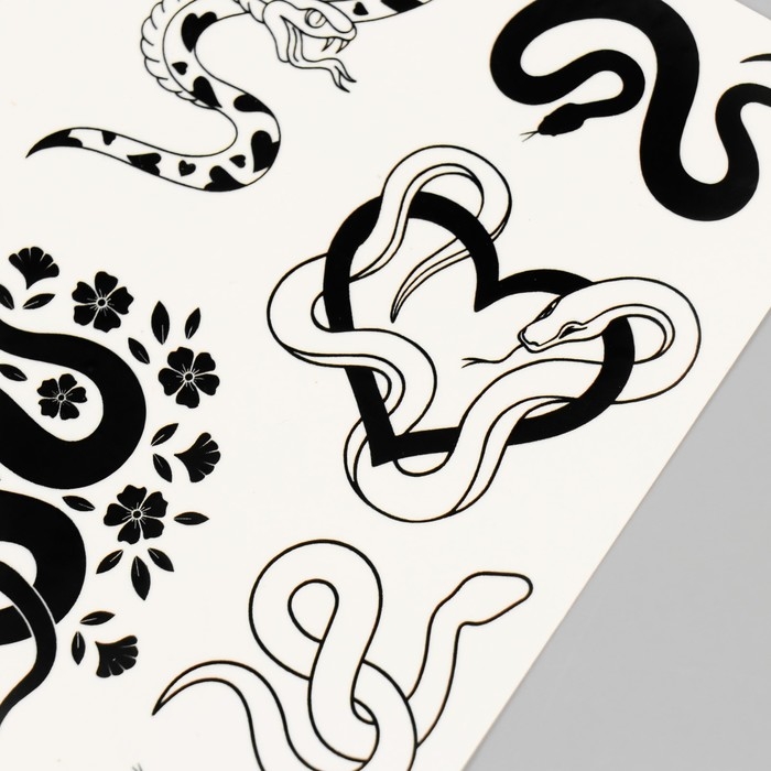 Новогодня татуировка на тело Ч/б змеи с сердечком"" 10х15 см