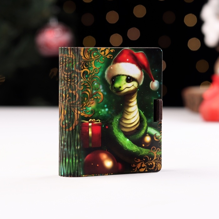 Новый год. Деревянный конверт для денег с символом года № 4 "Зеленый, змея с подарком", 9,8х8,5х2 см
