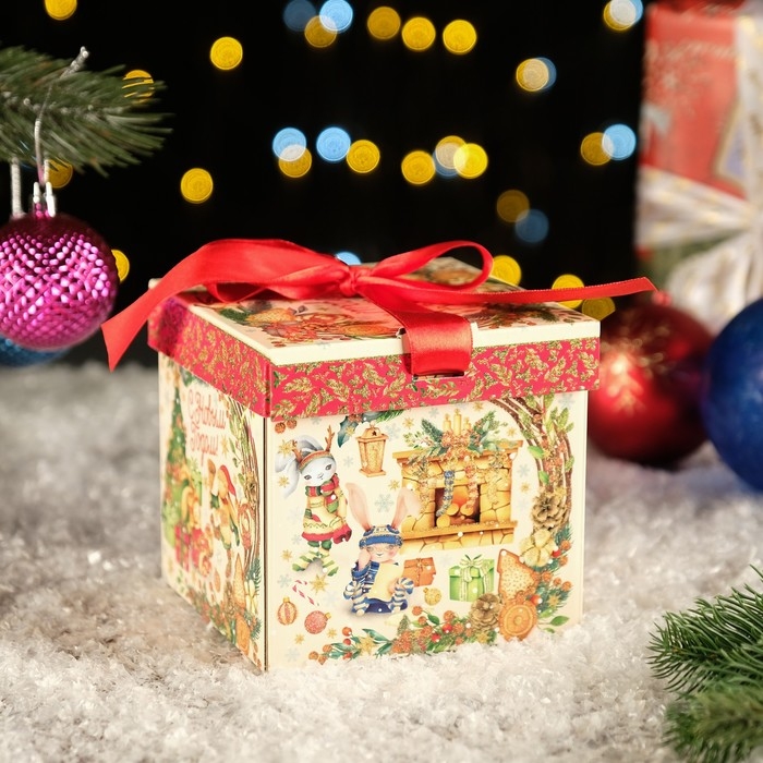 Новый год. Коробка подарочная складная "ХэппиТайм" 12,5 х 12,5 х 12 см.