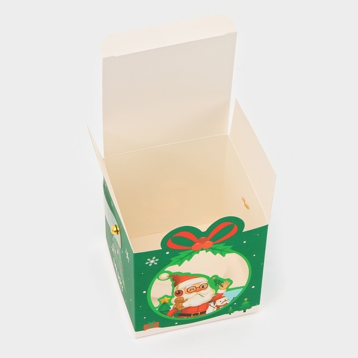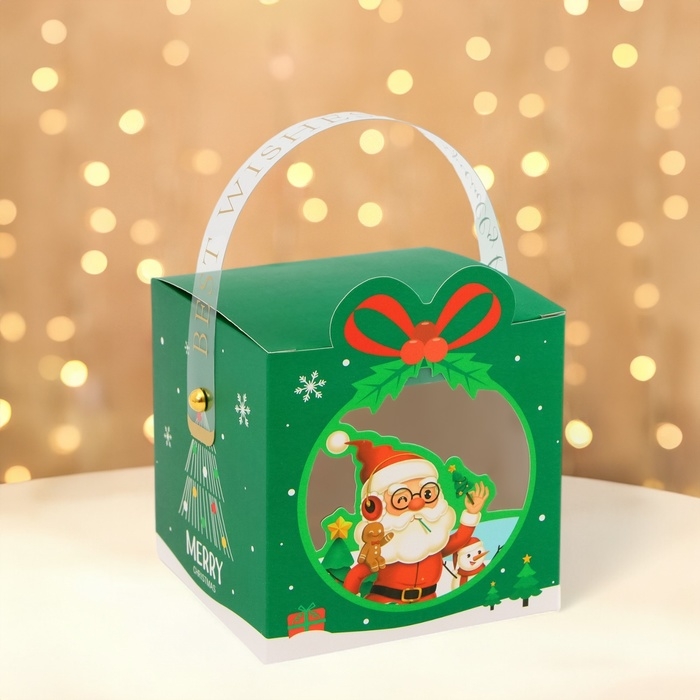 Новый год. Коробка складная с окном Новогодняя зеленая 10 х 10 х 12 см.