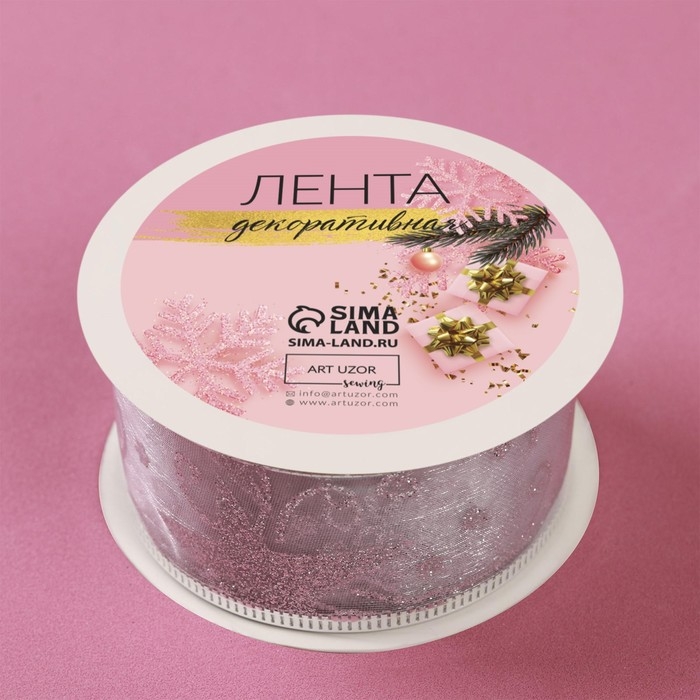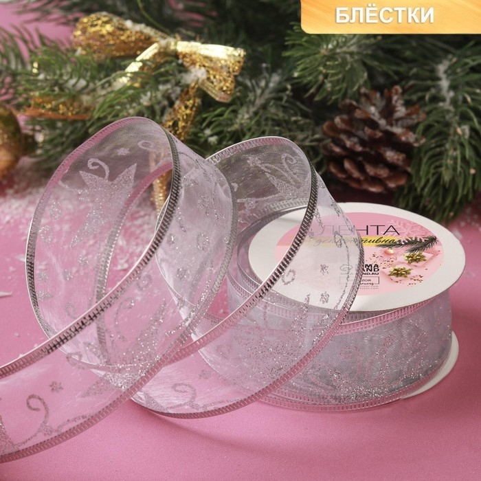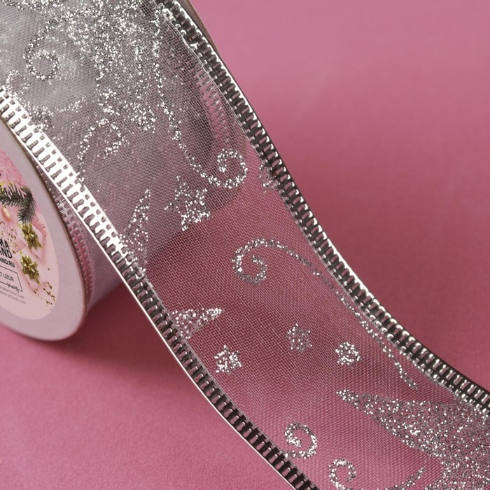 Новый год! Лента капроновая с металлической нитью «Звёзды и вьюнки», 38 мм × 2,7 ± 0,5 м, цвет серебряный
