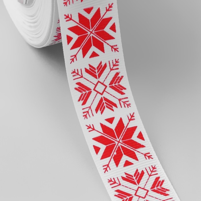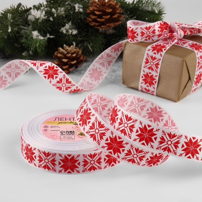 Новый год! Лента репсовая «Узорные снежинки», 25 мм, 23 ± 1 м, цвет белый/красный №1001