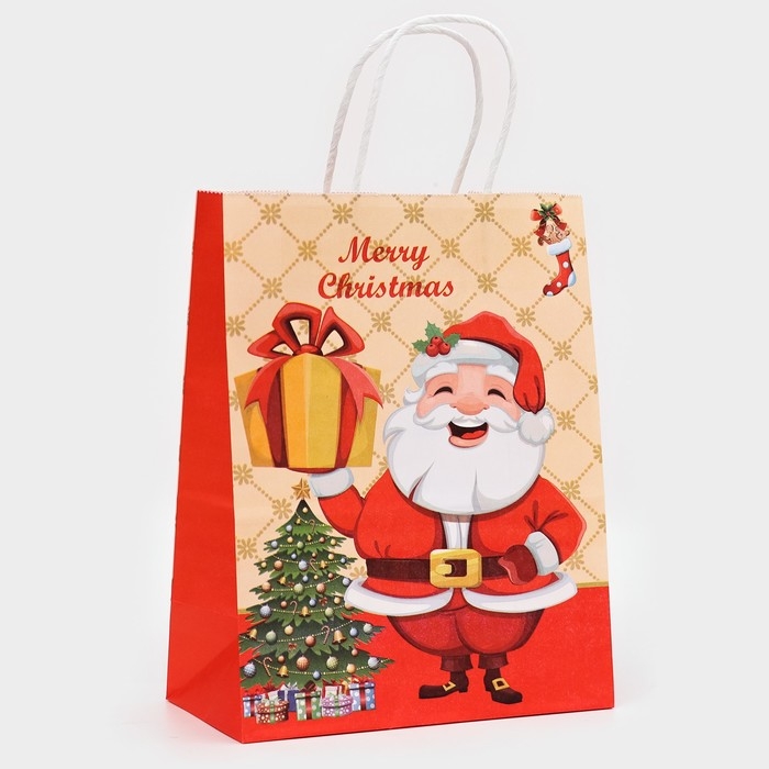 Новый год. Пакет бумажный подарочный новогодний крафт "Дед Мороз с подарком", 27 х 21 х 11 см.