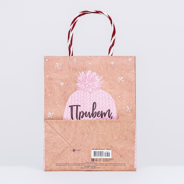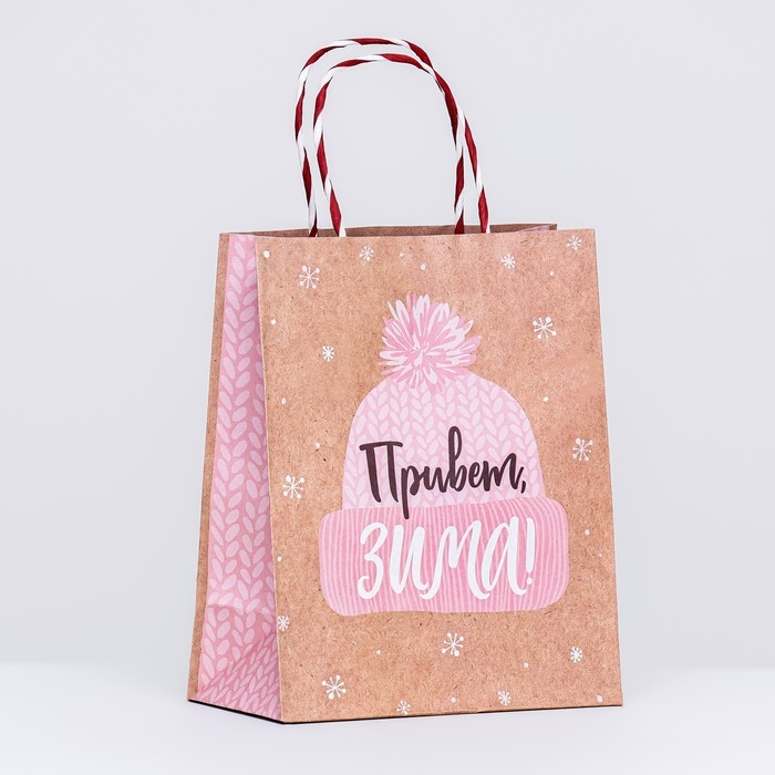 Новый год. Пакет бумажный подарочный новогодний крафт "Привет,зима" 18 х 22,3 х 10 см.